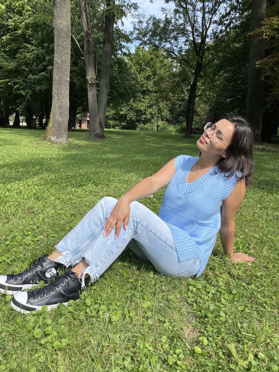 Dámská pletená vesta bez rukávů v sytě modré barvě.