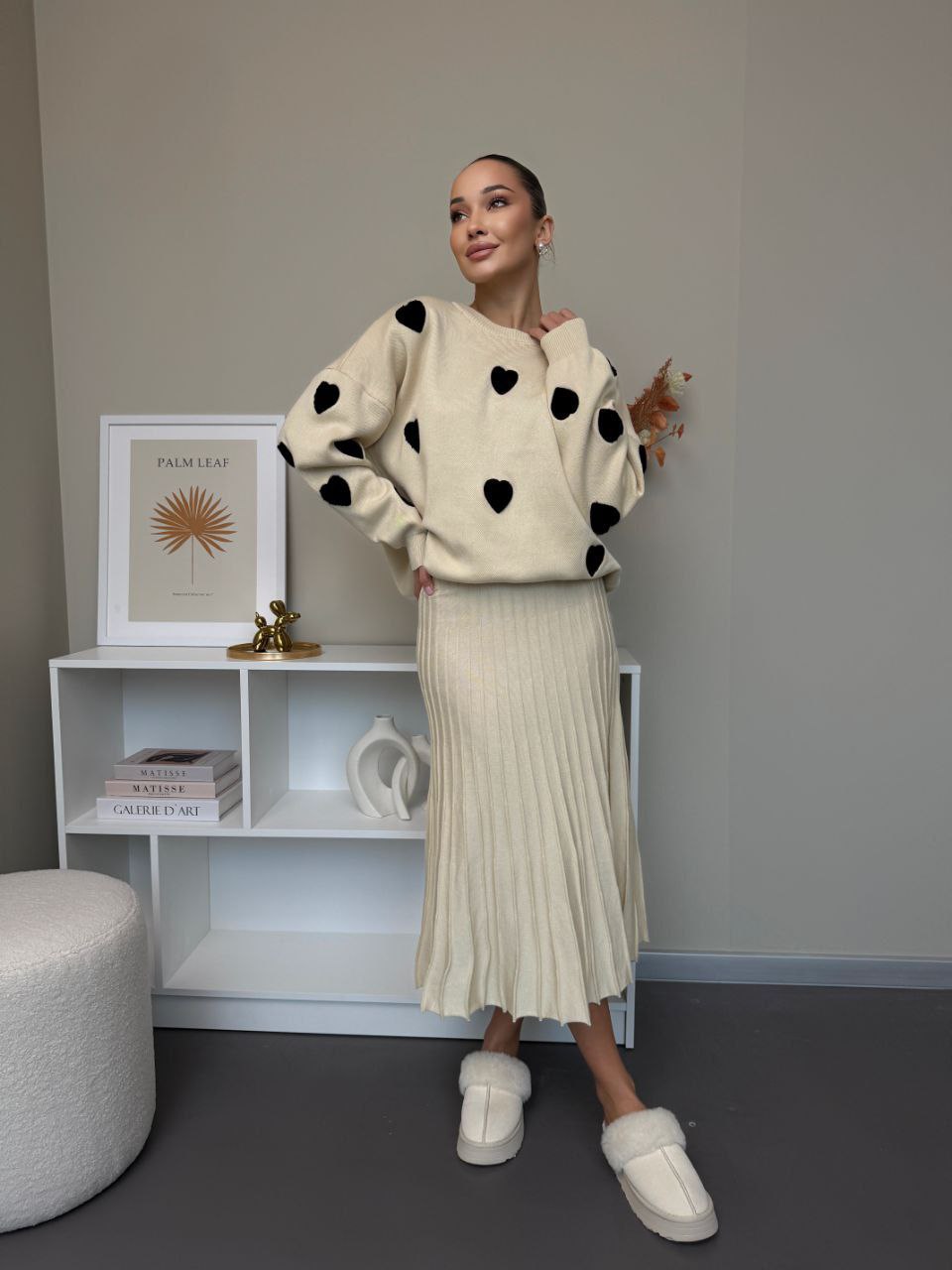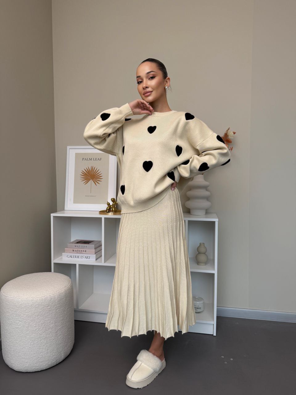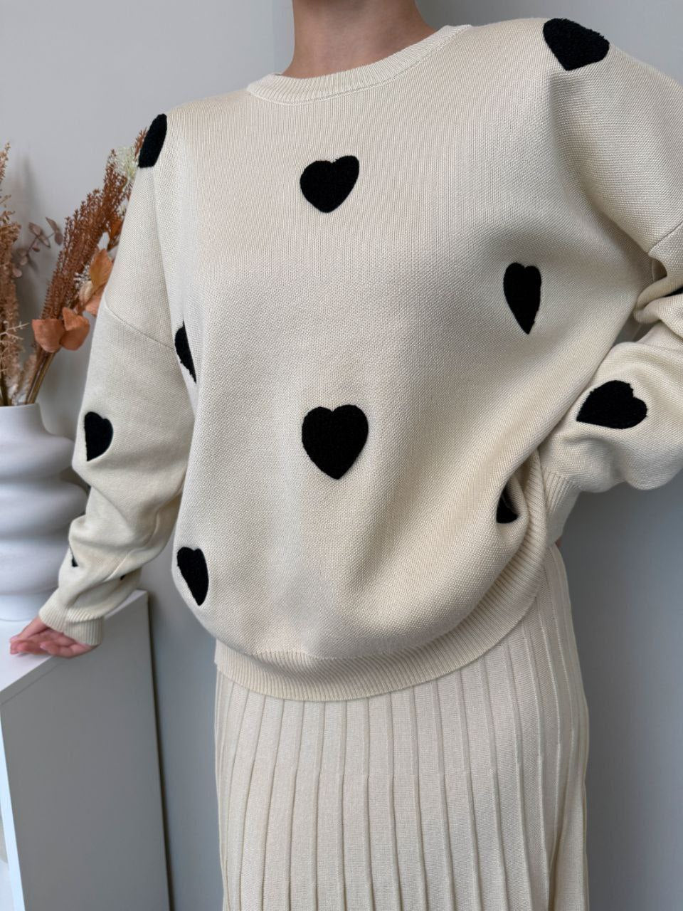 Elegantní set, který spojuje pohodlí a styl. Vyrobeno z jemného úpletu vysoké kvality. Originálním prvkem jsou měkké plyšové srdíčka, které dodávají outfitu romantický a moderní vzhled. Ideální volba pro každodenní nošení i speciální příležitosti.