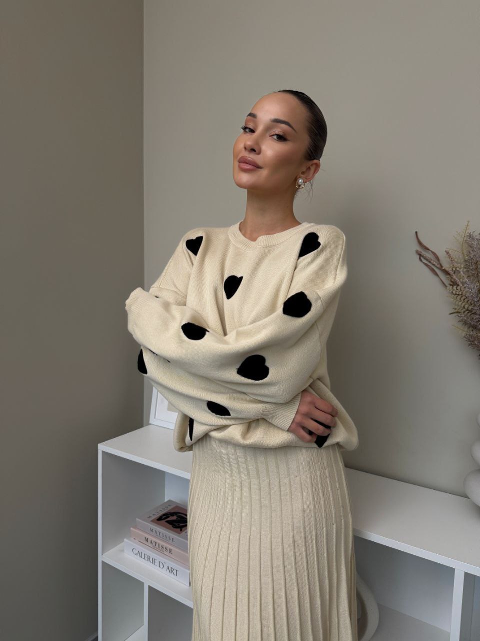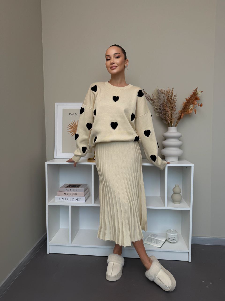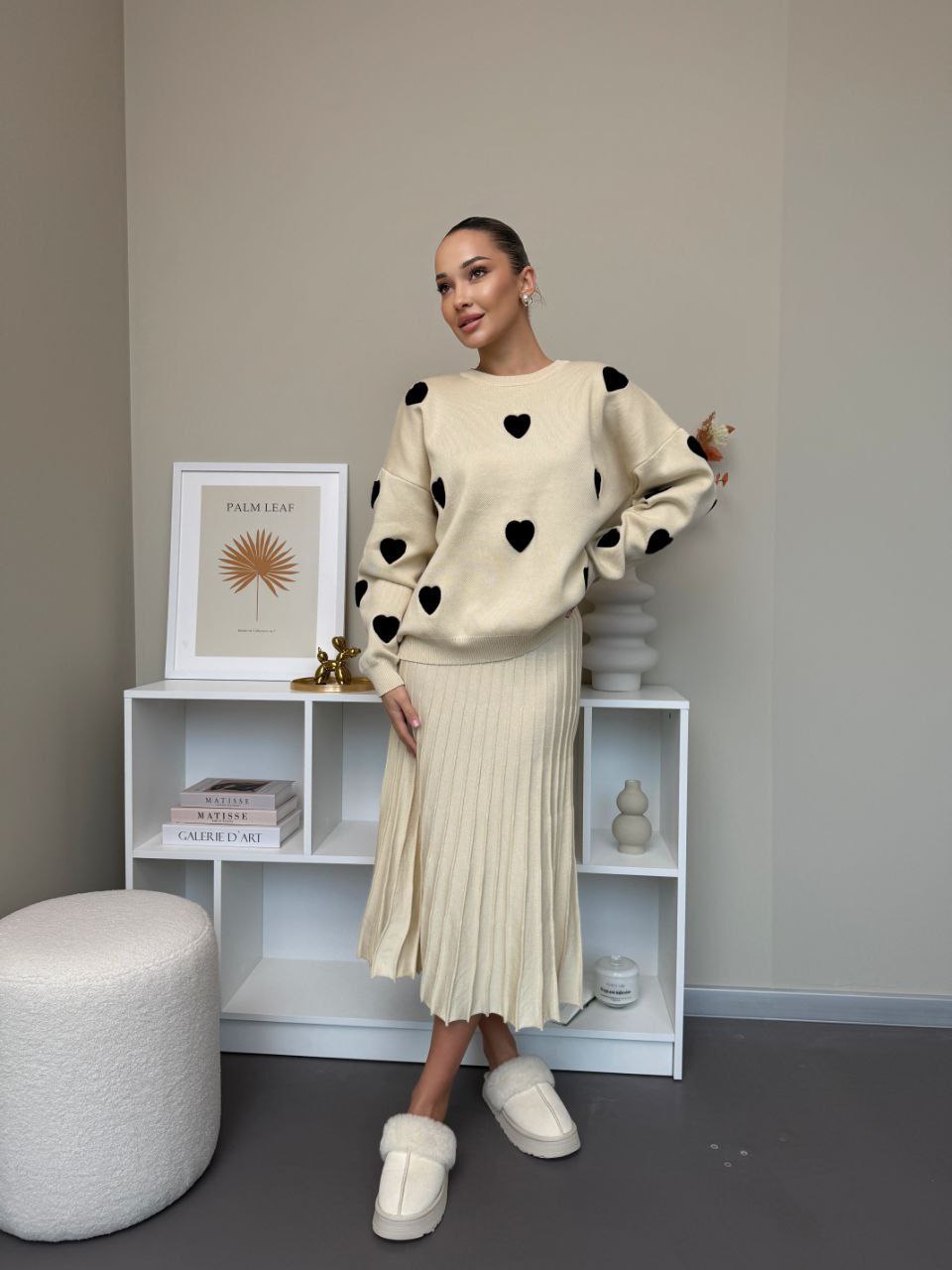 Elegantní set, který spojuje pohodlí a styl. Vyrobeno z jemného úpletu vysoké kvality. Originálním prvkem jsou měkké plyšové srdíčka, které dodávají outfitu romantický a moderní vzhled. Ideální volba pro každodenní nošení i speciální příležitosti.