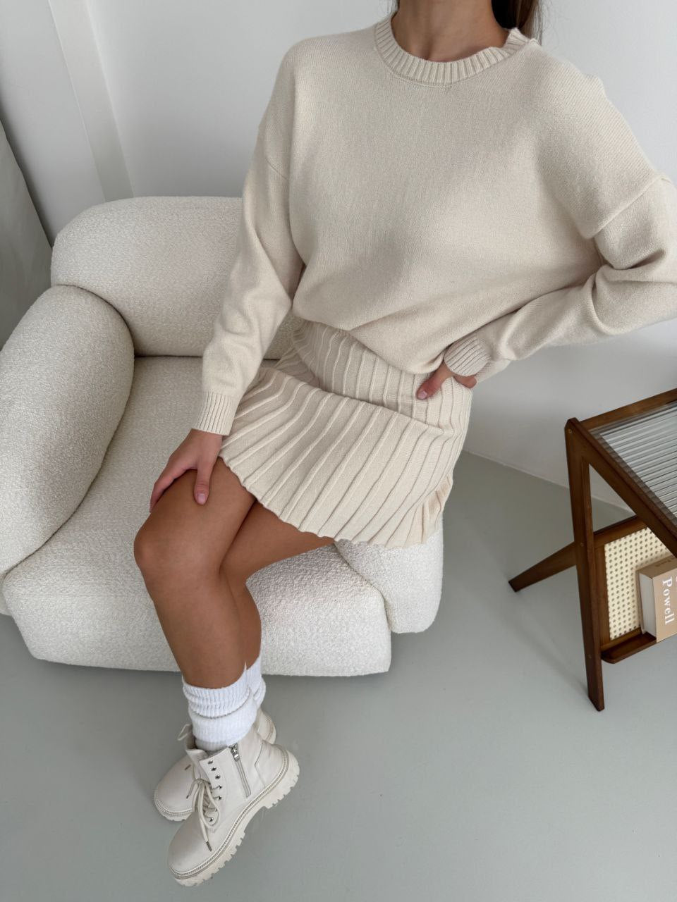 Kostým, který se skládá ze svetru a plisované sukně