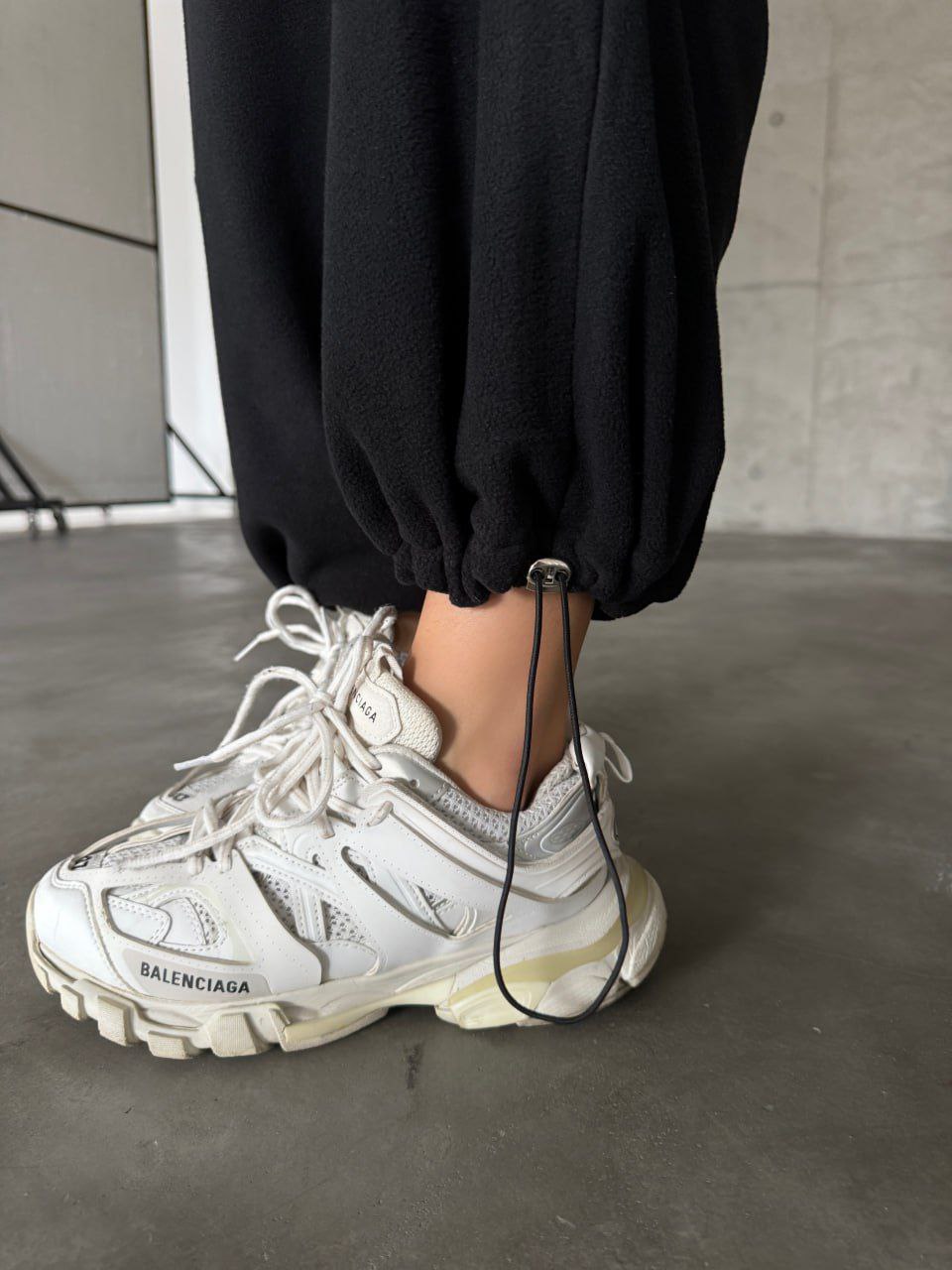 Model má zapínání na zip, v pase je guma, kalhoty jsou rovného střihu s gumičkou místo manžet (lze stáhnout).