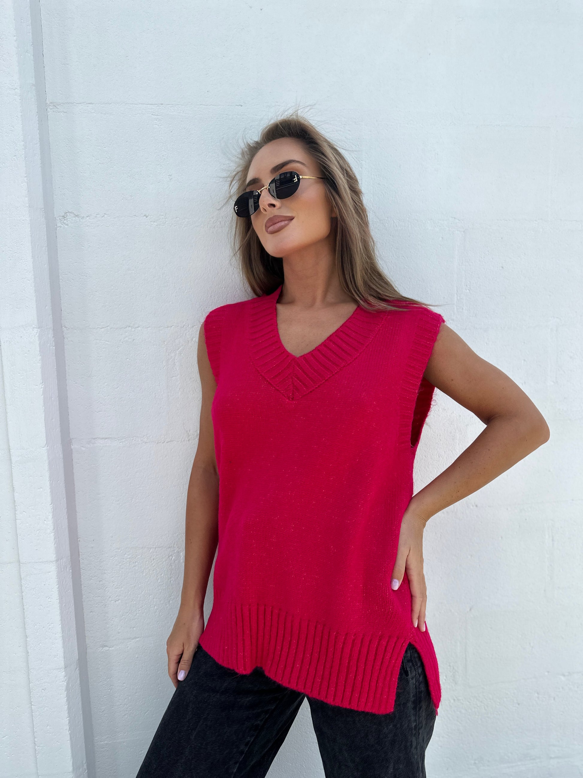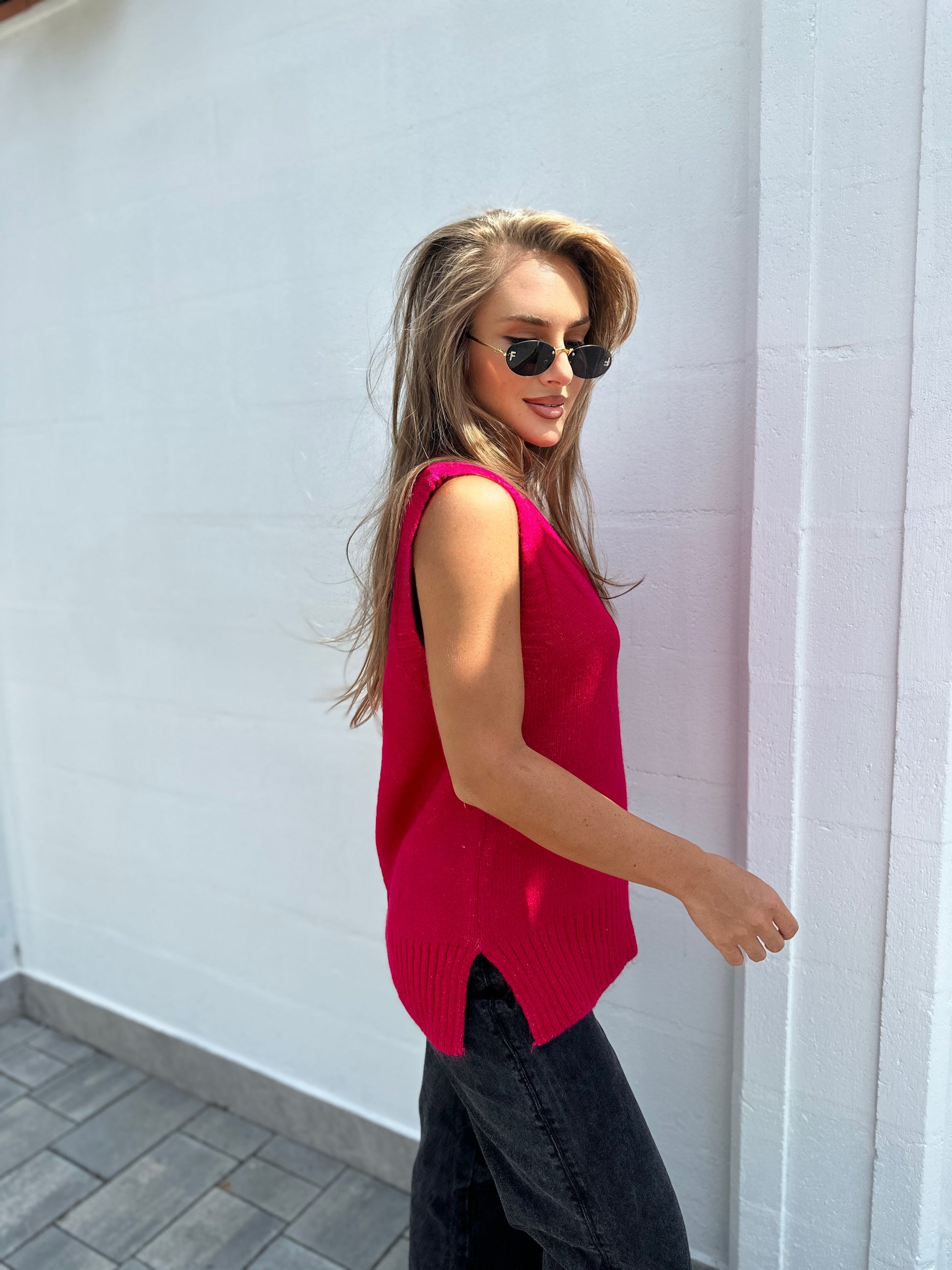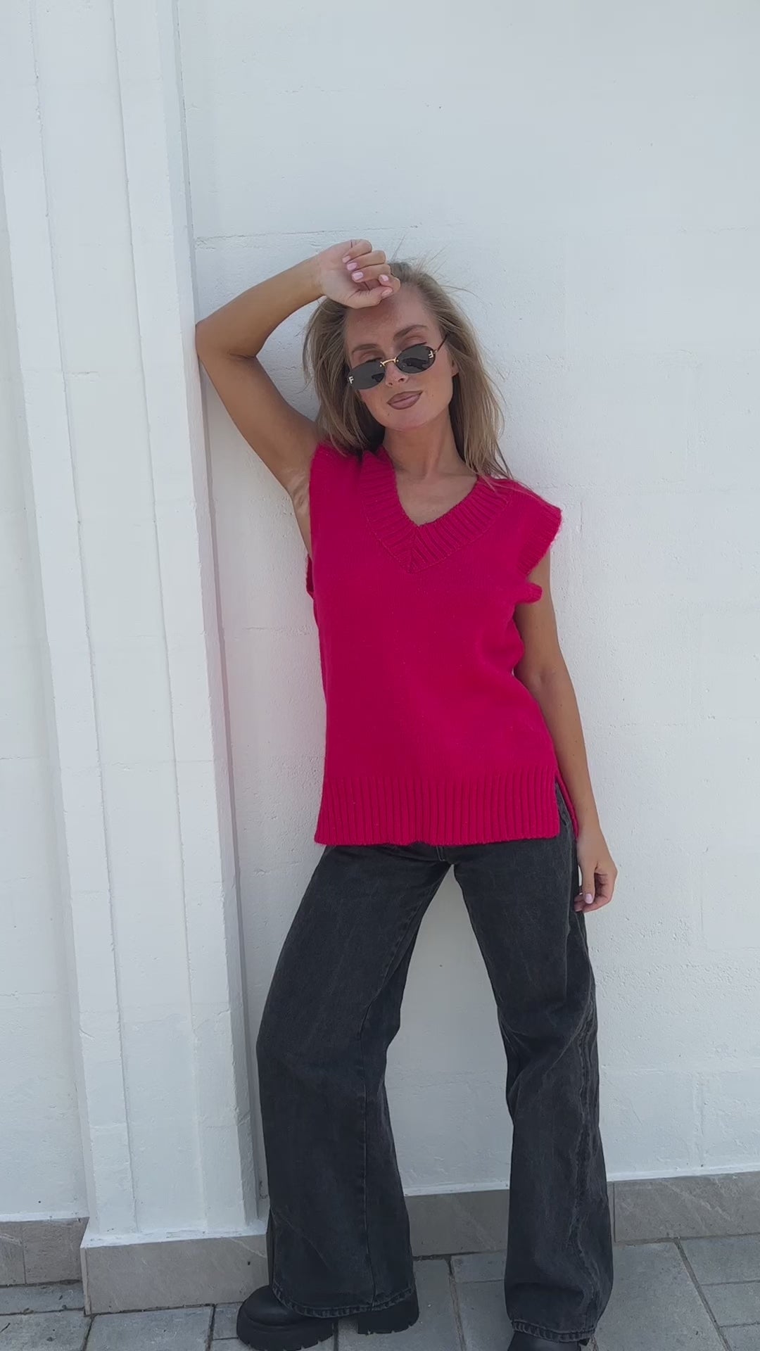 Dámská pletená vesta bez rukávů v sytě růžové barvě.