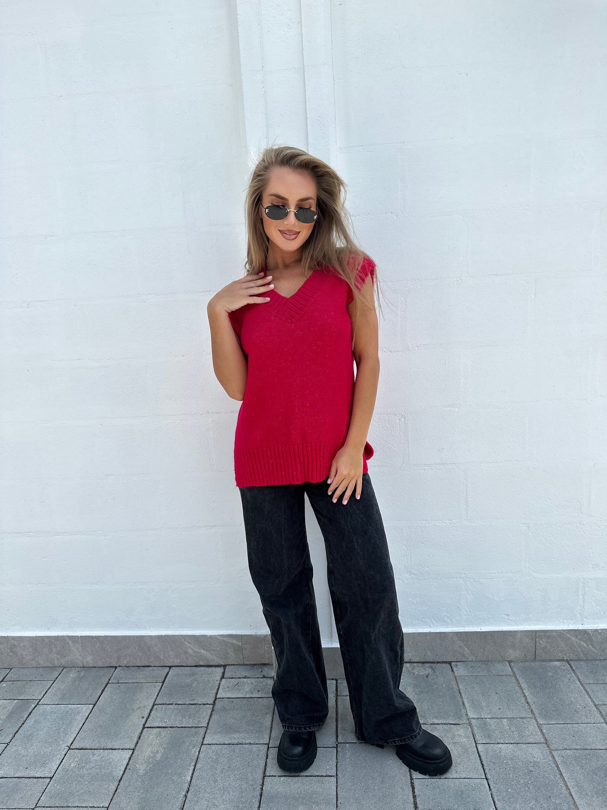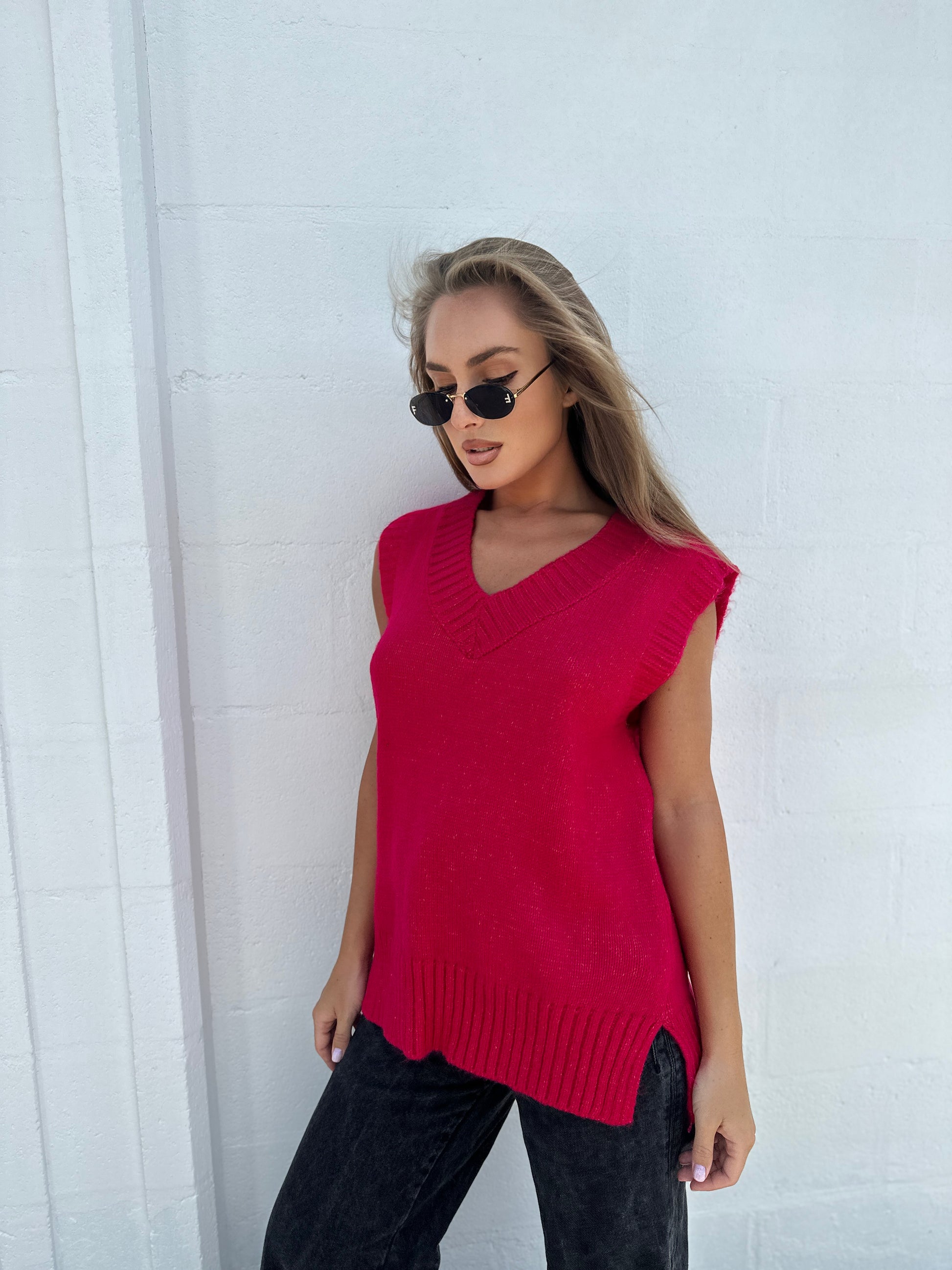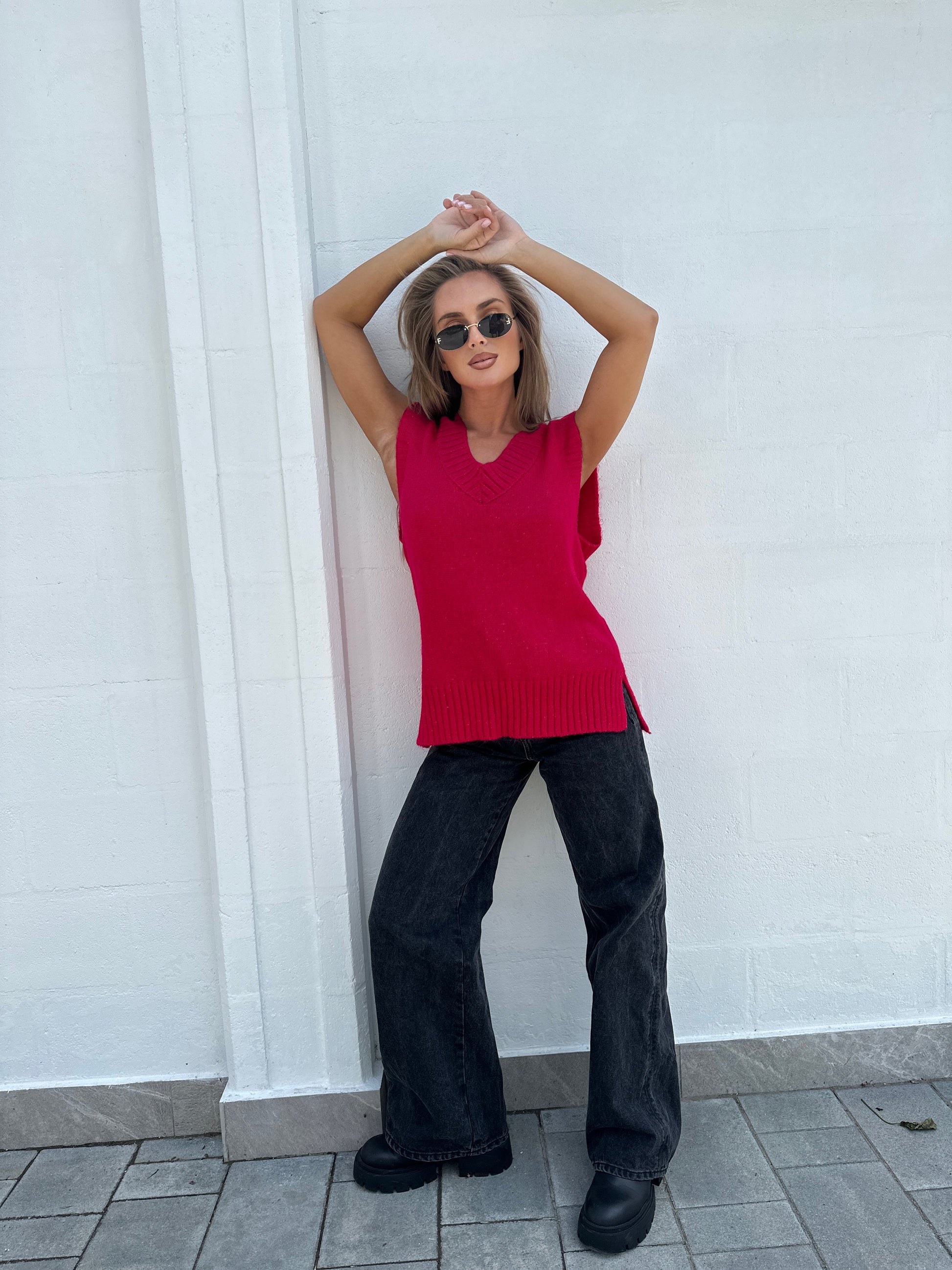 Dámská pletená vesta bez rukávů v sytě růžové barvě.