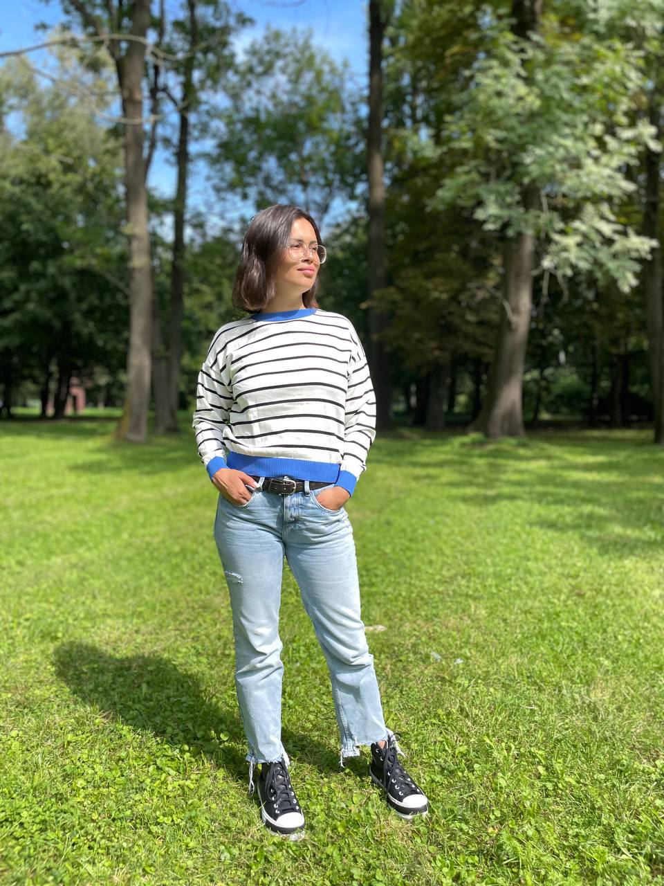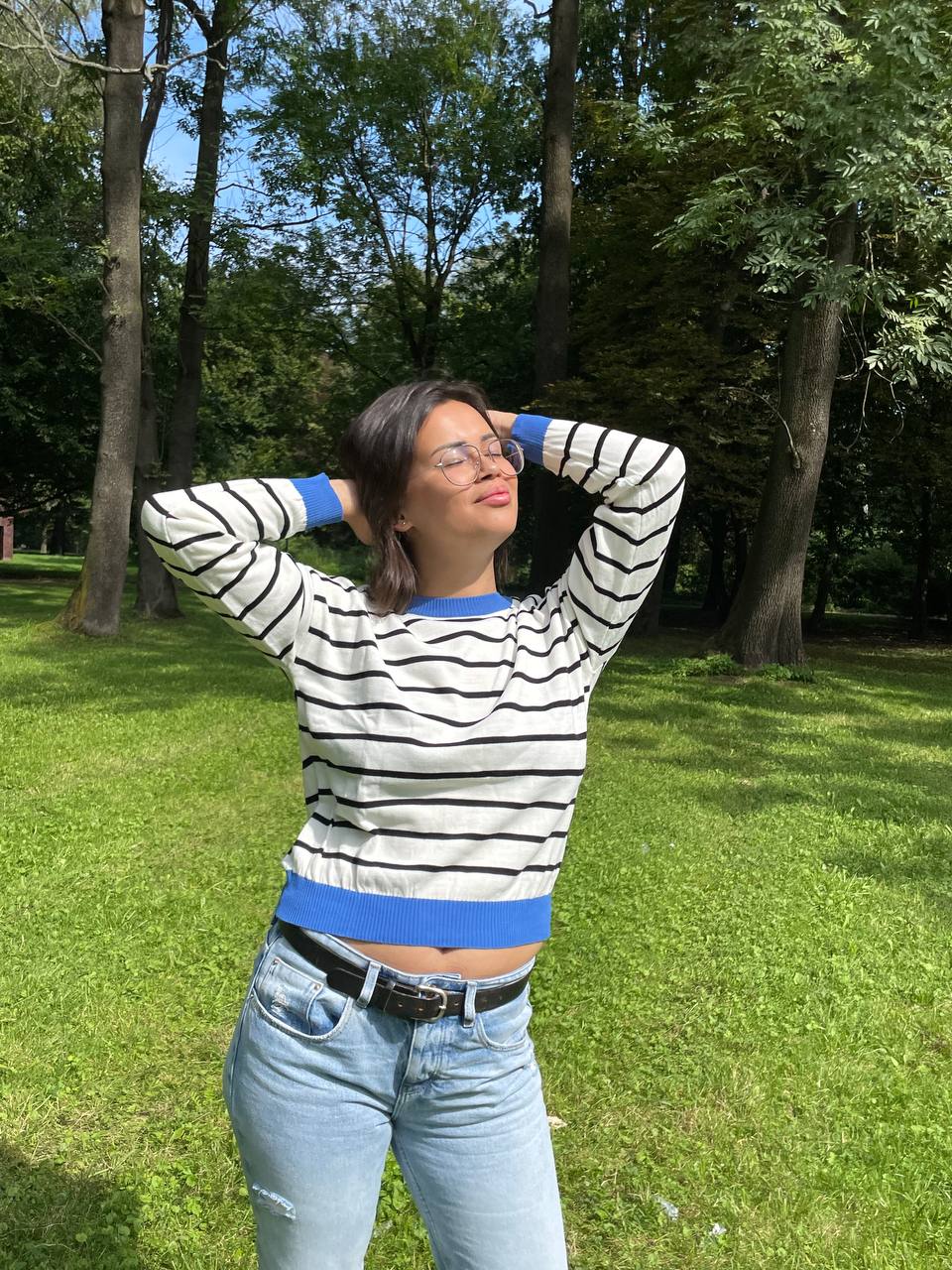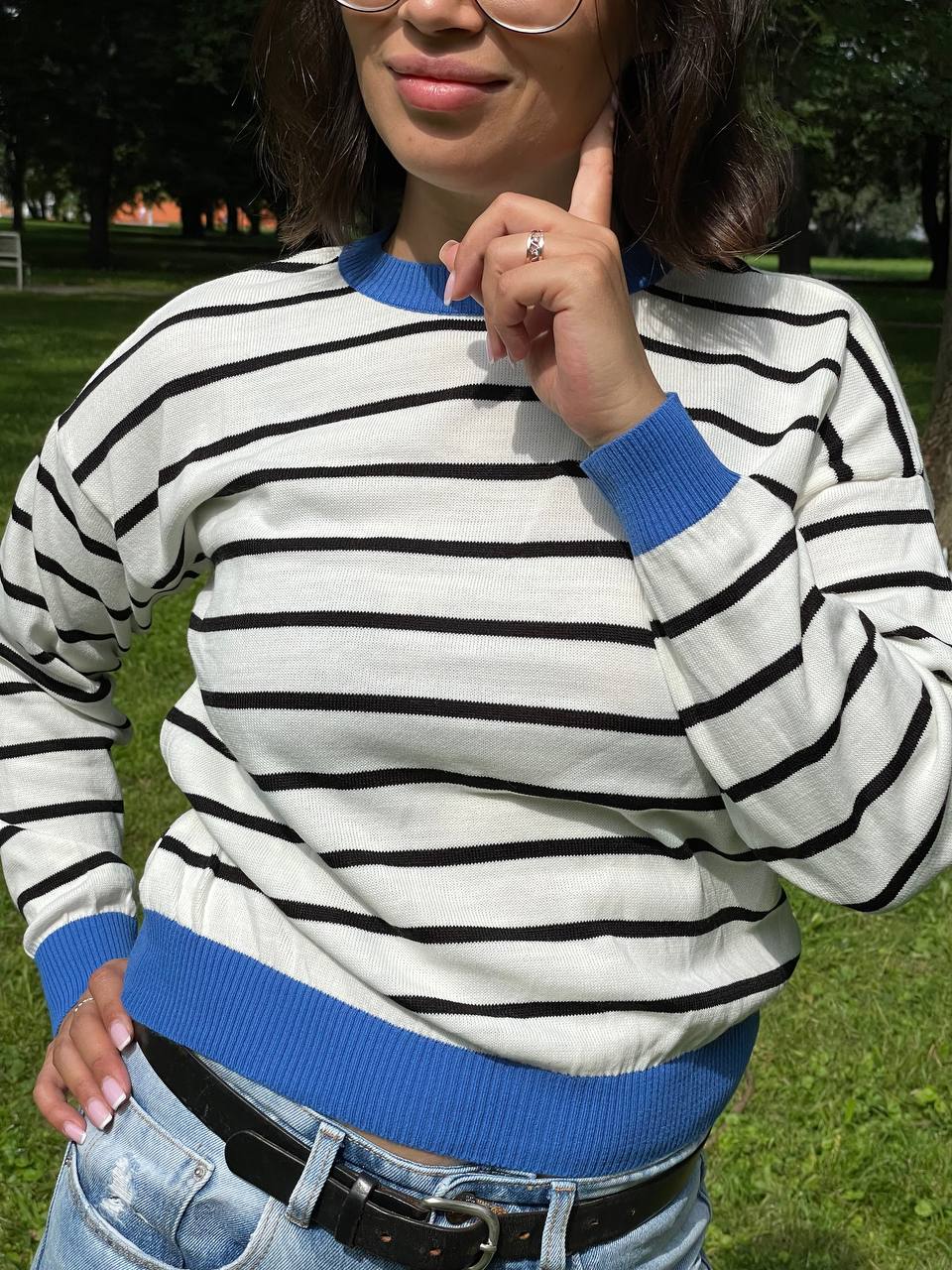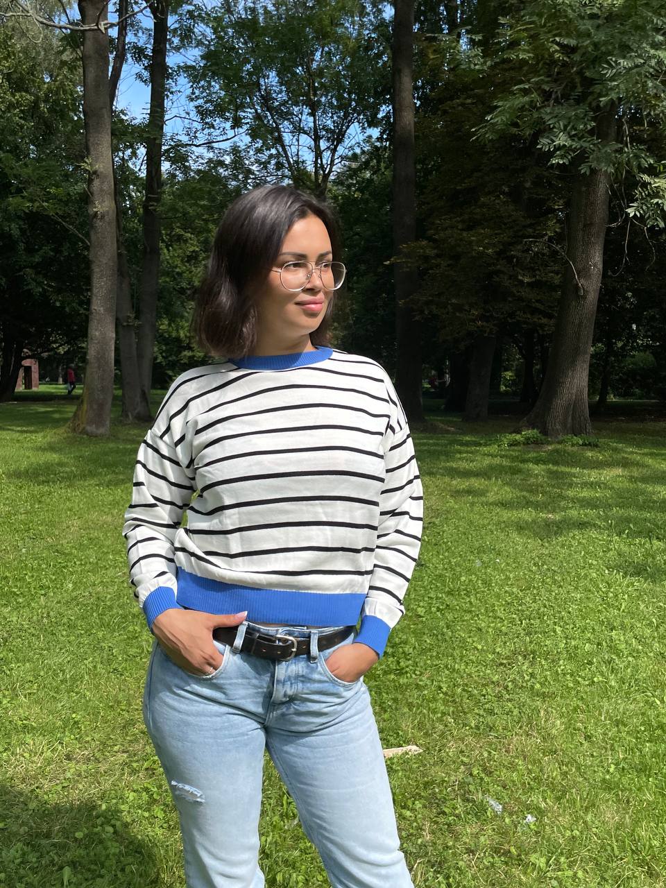 Krátký dámský svetr z měkkého akrylu s moderním pruhovaným vzorem.